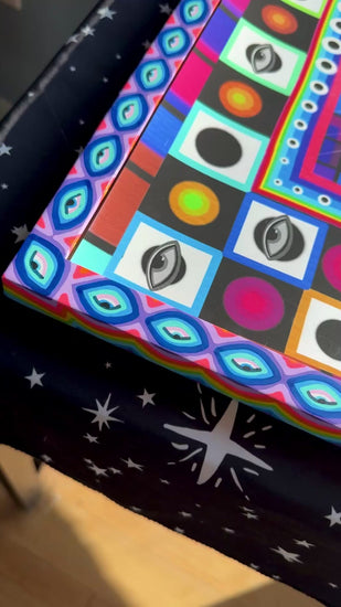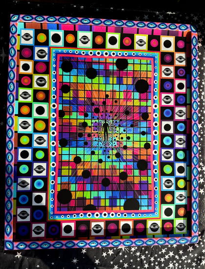 Matte finish, with a white border, high quality giclee print with acrylic hand-painted unique frames!! :) There is one frame with rainbow eyes, and one with shimmering black sparkles.